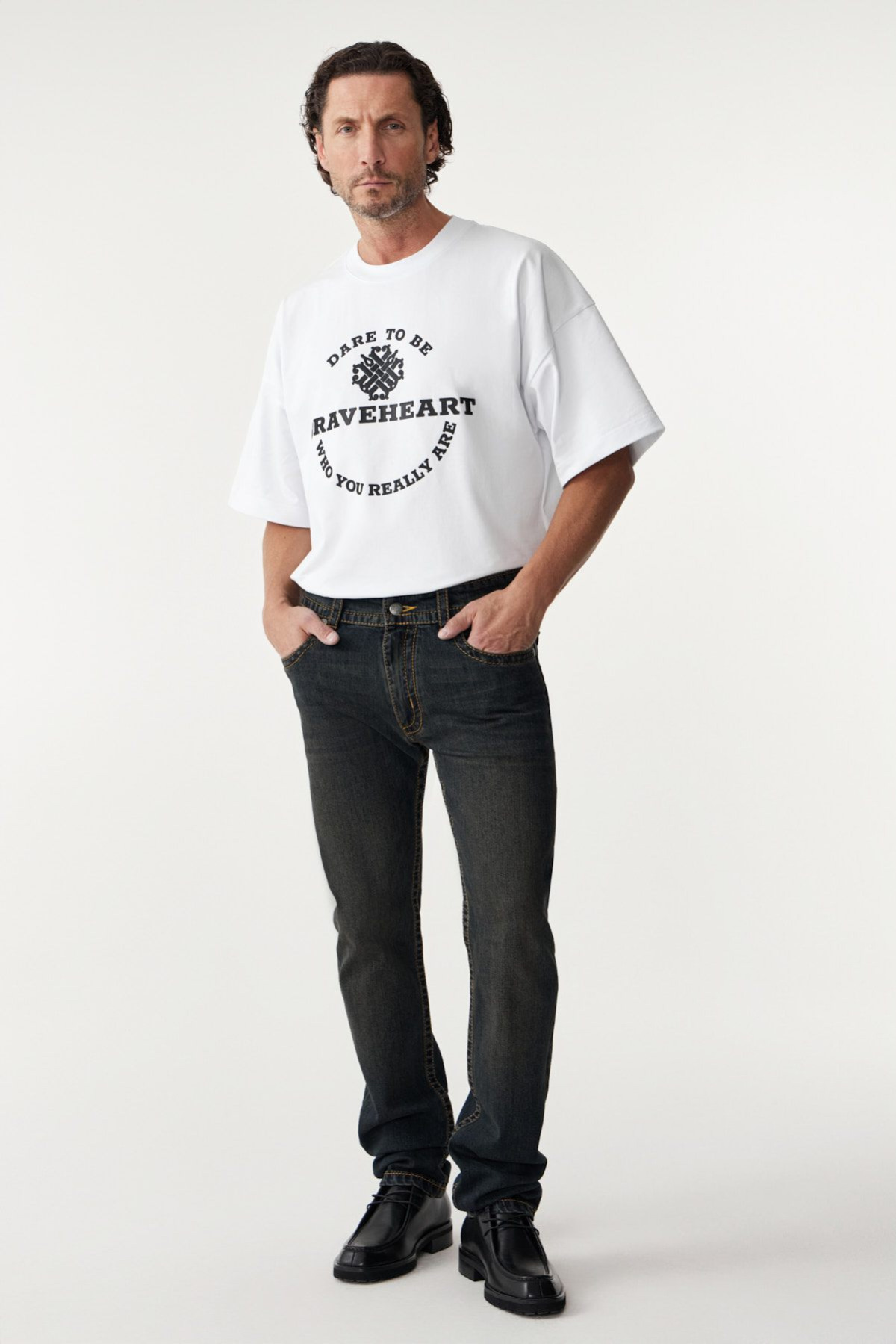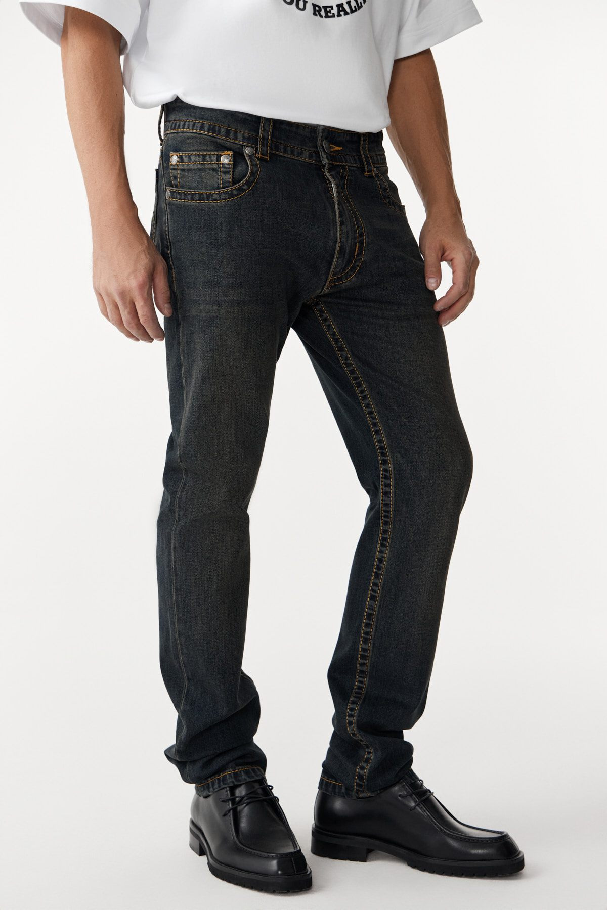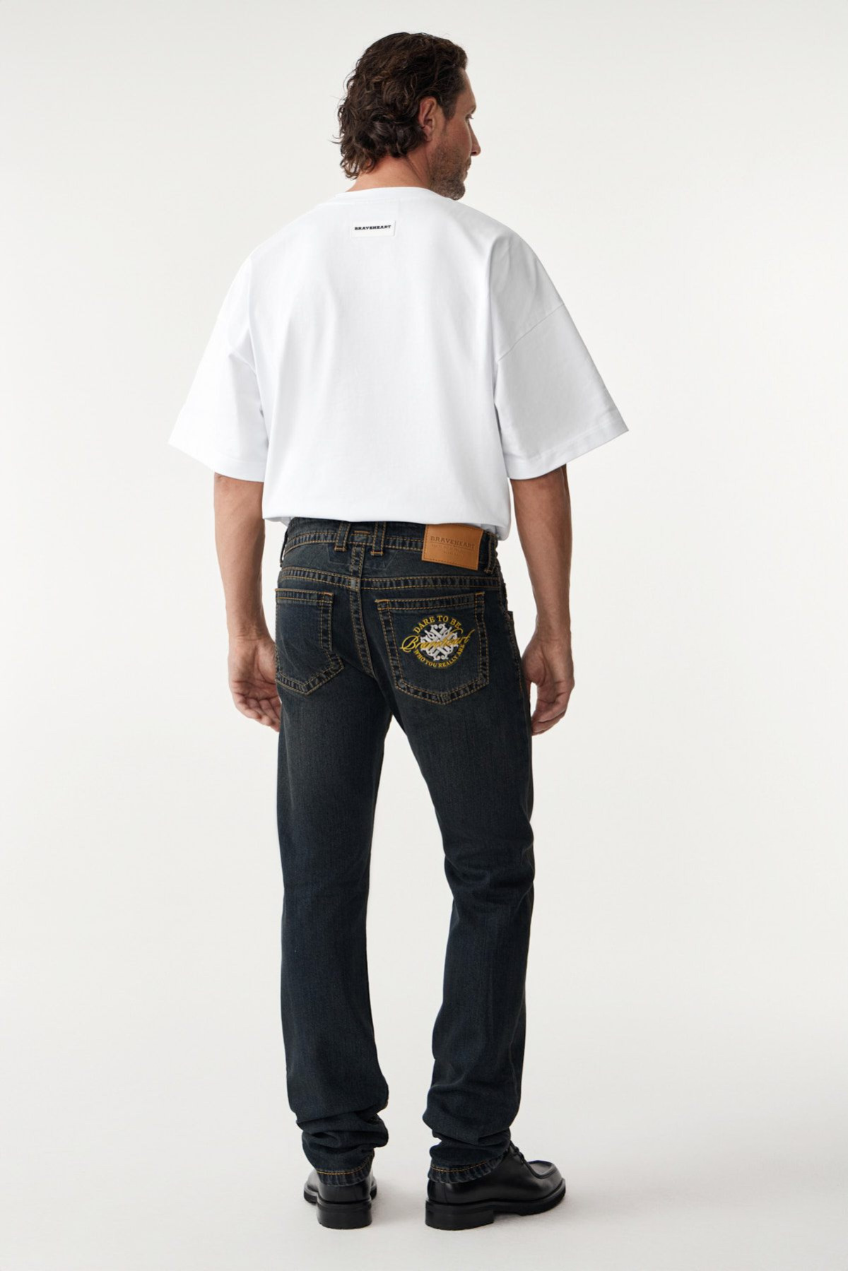Джинсы прошиты фирменной широкой строчкой размером 12.8 мм. Декоративная вышивка на заднем кармане завершает бунтарский образ, а брендированные элементы — пуговицы, хольнитены, молнии и кожаный патч — подчеркивают премиальное качество изделия.